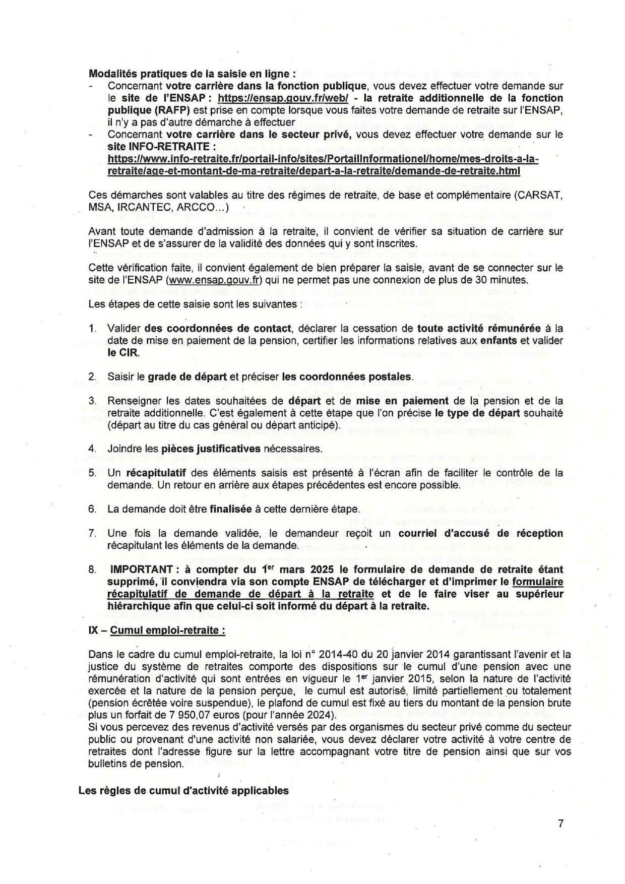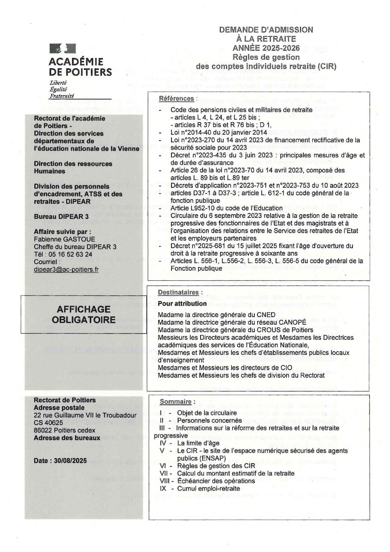 Vous trouverez ci-joint les différentes circulaires dates, démarches à faire pour votre demande de départ en retraite ou en retraite progressive.