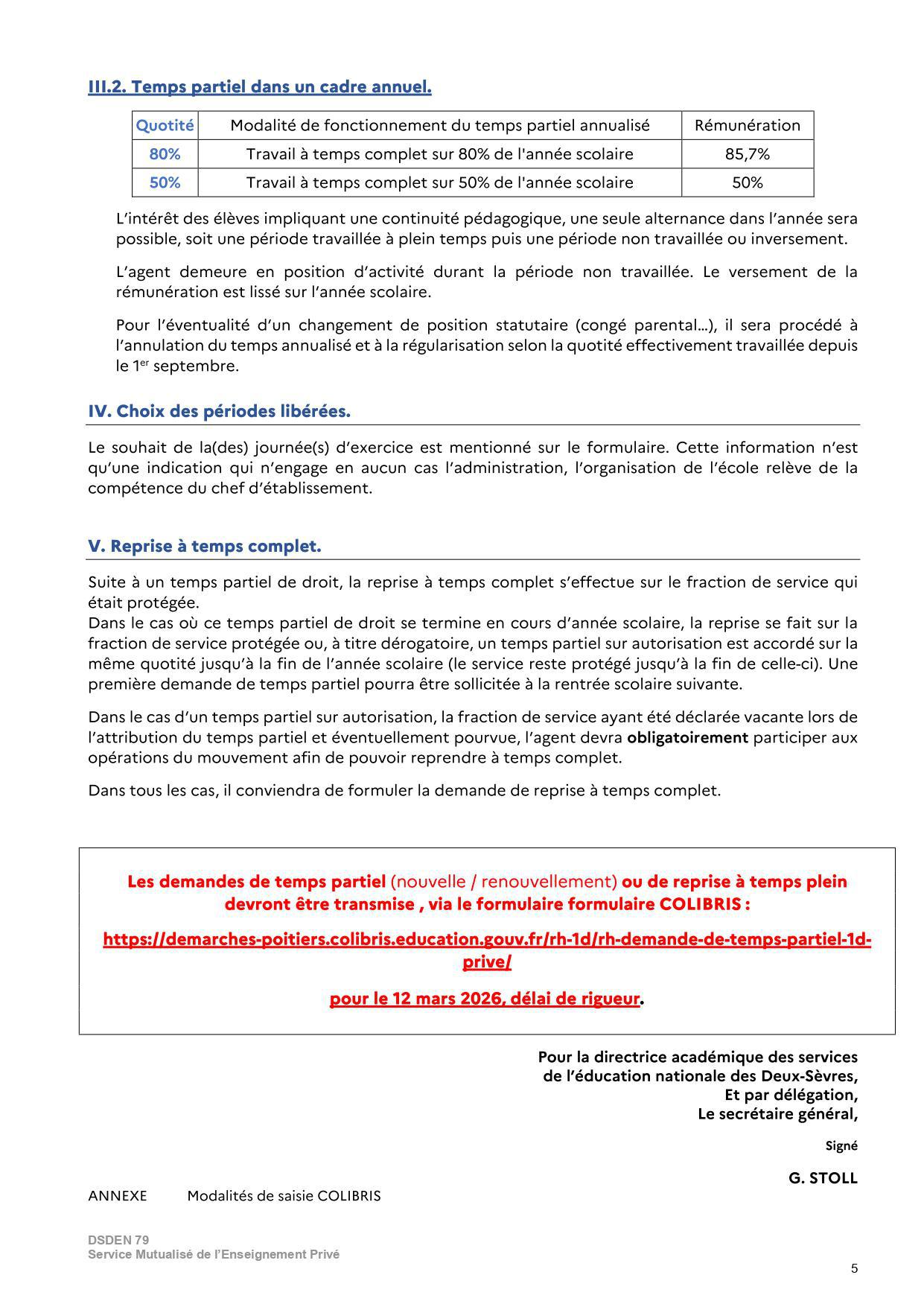 Demande de Temps partiel ou retour à temps complet à faire avant le 12 mars 2026 sur Colibri.