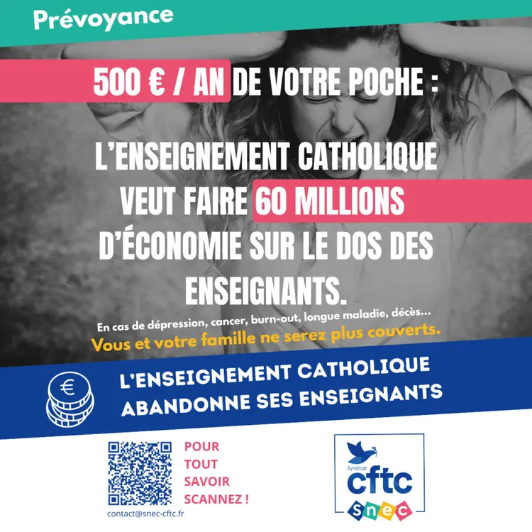 La prévoyance des enseignants est en danger ! On vous explique tout.L’enseignement catholique abandonne ses enseignants et se retire de la convention protectrice de la prévoyance santé. Cette couverture santé existait depuis 1978. Nous connaissons là le pire recul social depuis que nous sommes agent